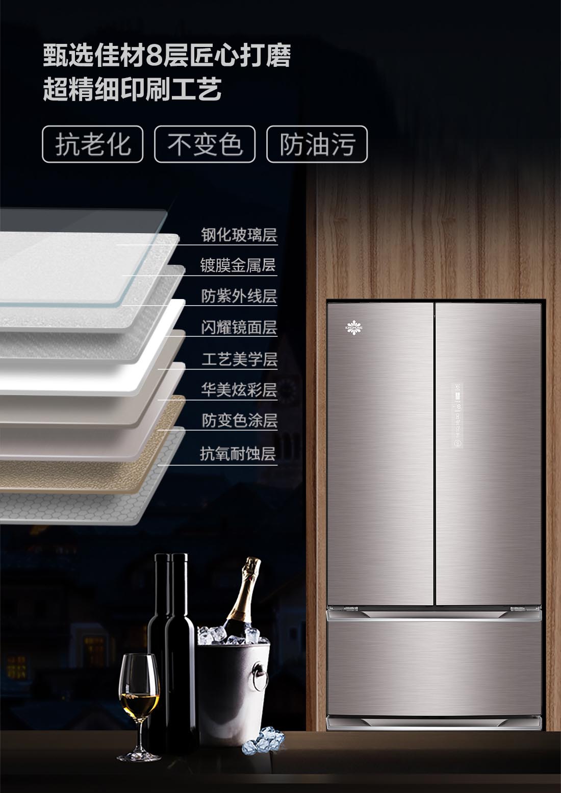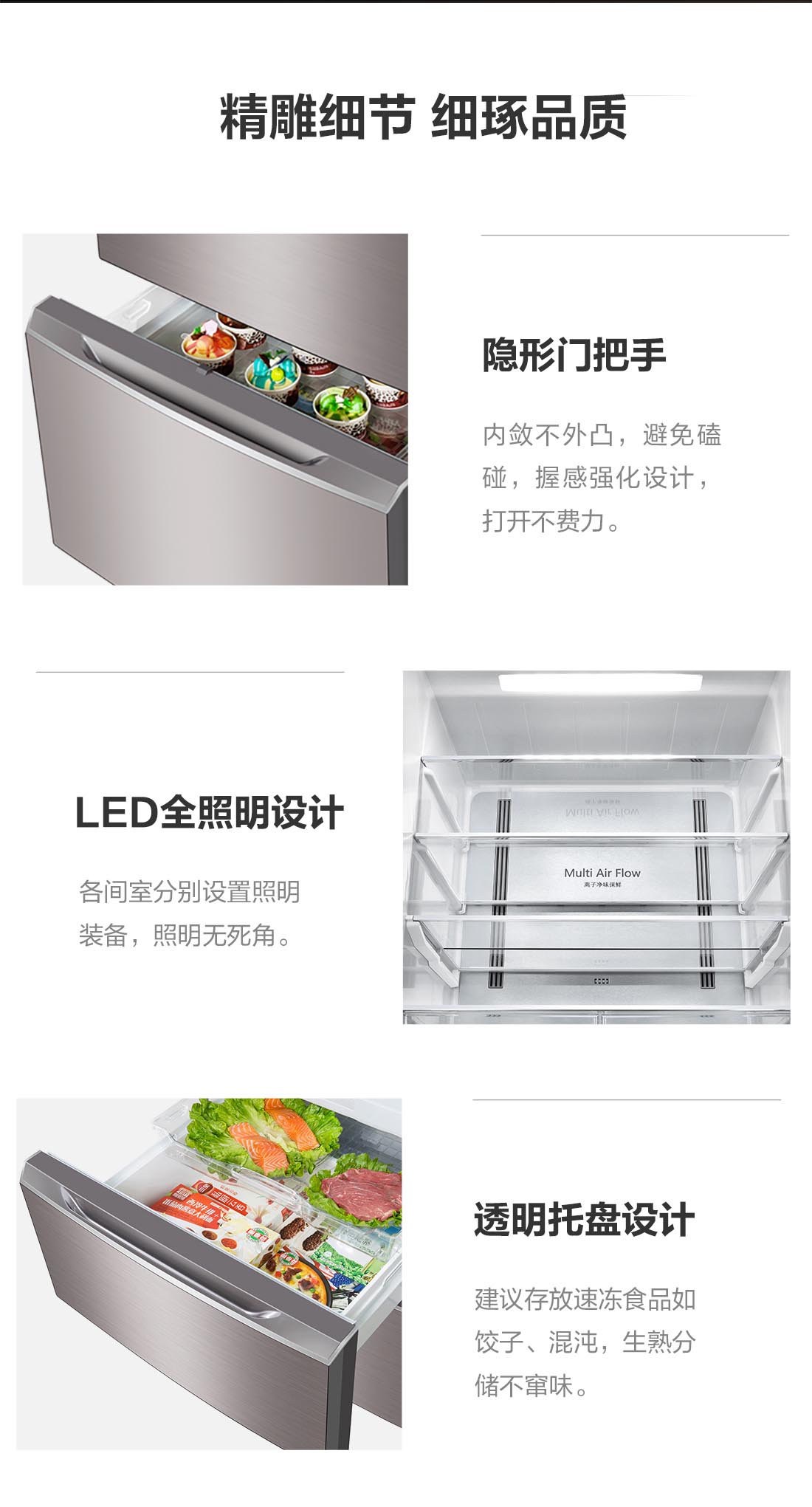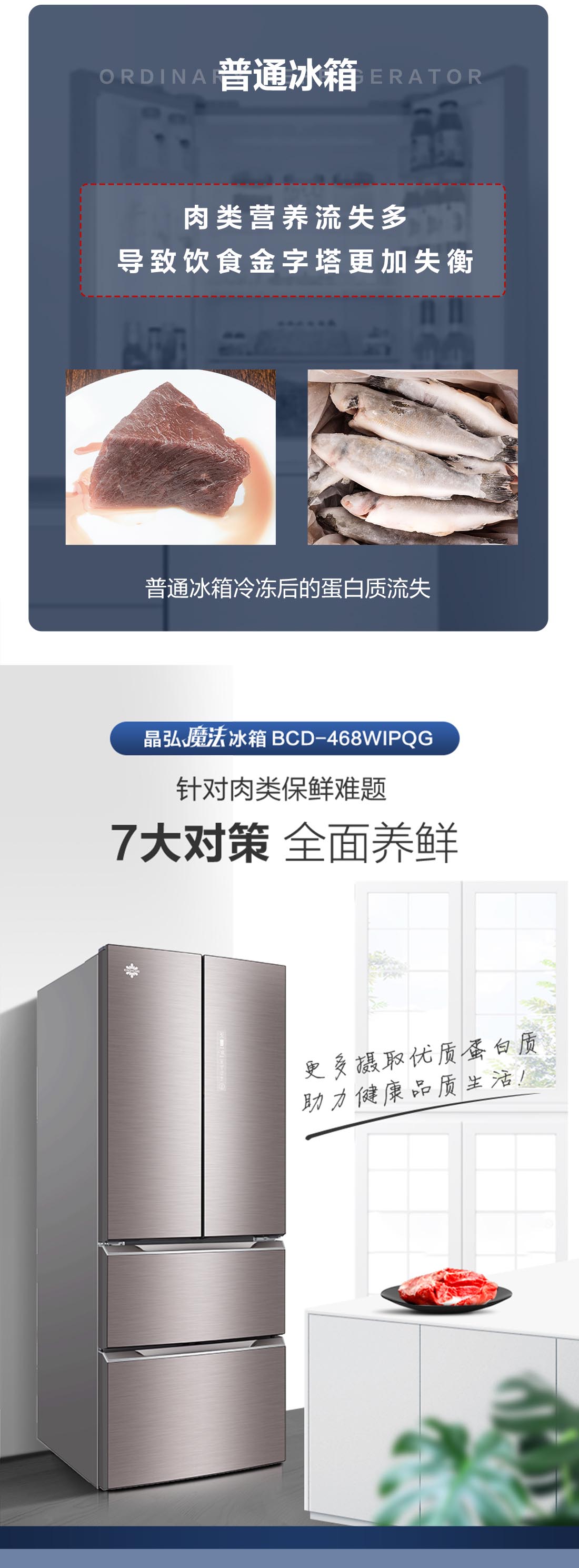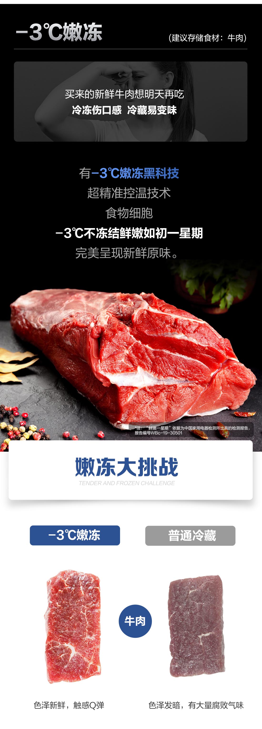 搭載-5℃瞬凍黑科技,鮮嫩兩星期,輕松一刀切。細胞級養鮮,營養流失少。搭載-3℃嫩凍黑科技,食材不結冰,鮮嫩一整周。智能全變頻技術,恒溫保鮮,節能靜音。