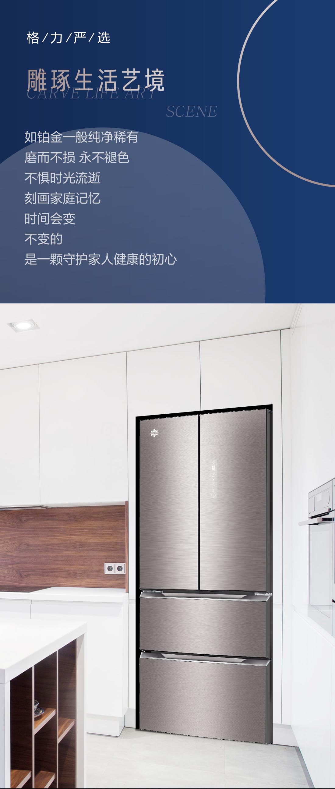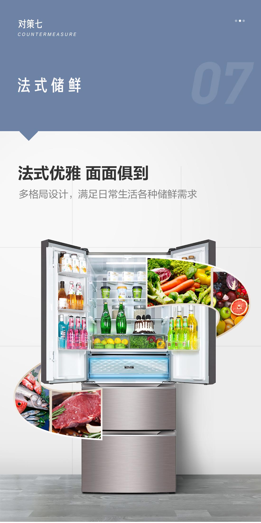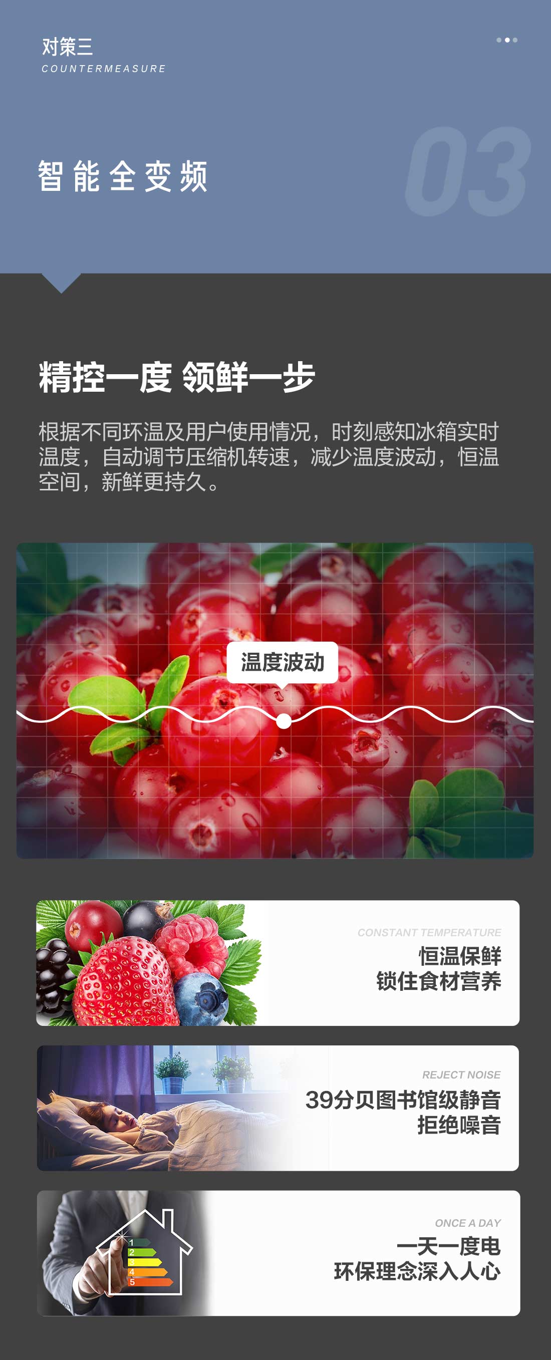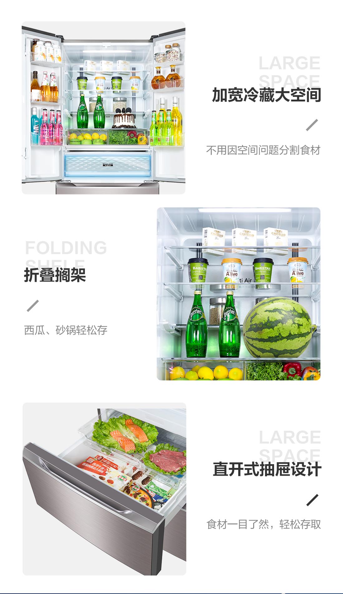 搭載-5℃瞬凍黑科技,鮮嫩兩星期,輕松一刀切。細胞級養鮮,營養流失少。搭載-3℃嫩凍黑科技,食材不結冰,鮮嫩一整周。智能全變頻技術,恒溫保鮮,節能靜音。