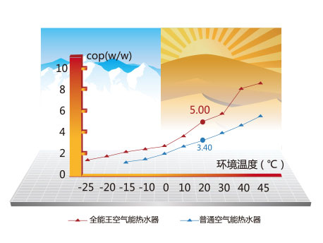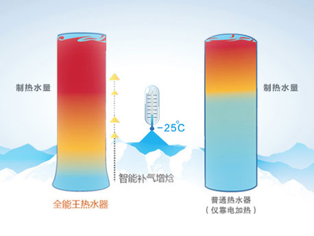 采用低溫智能增焓系統,具有雙重動力,可在-25℃至45℃寬工況條件下制取熱水
